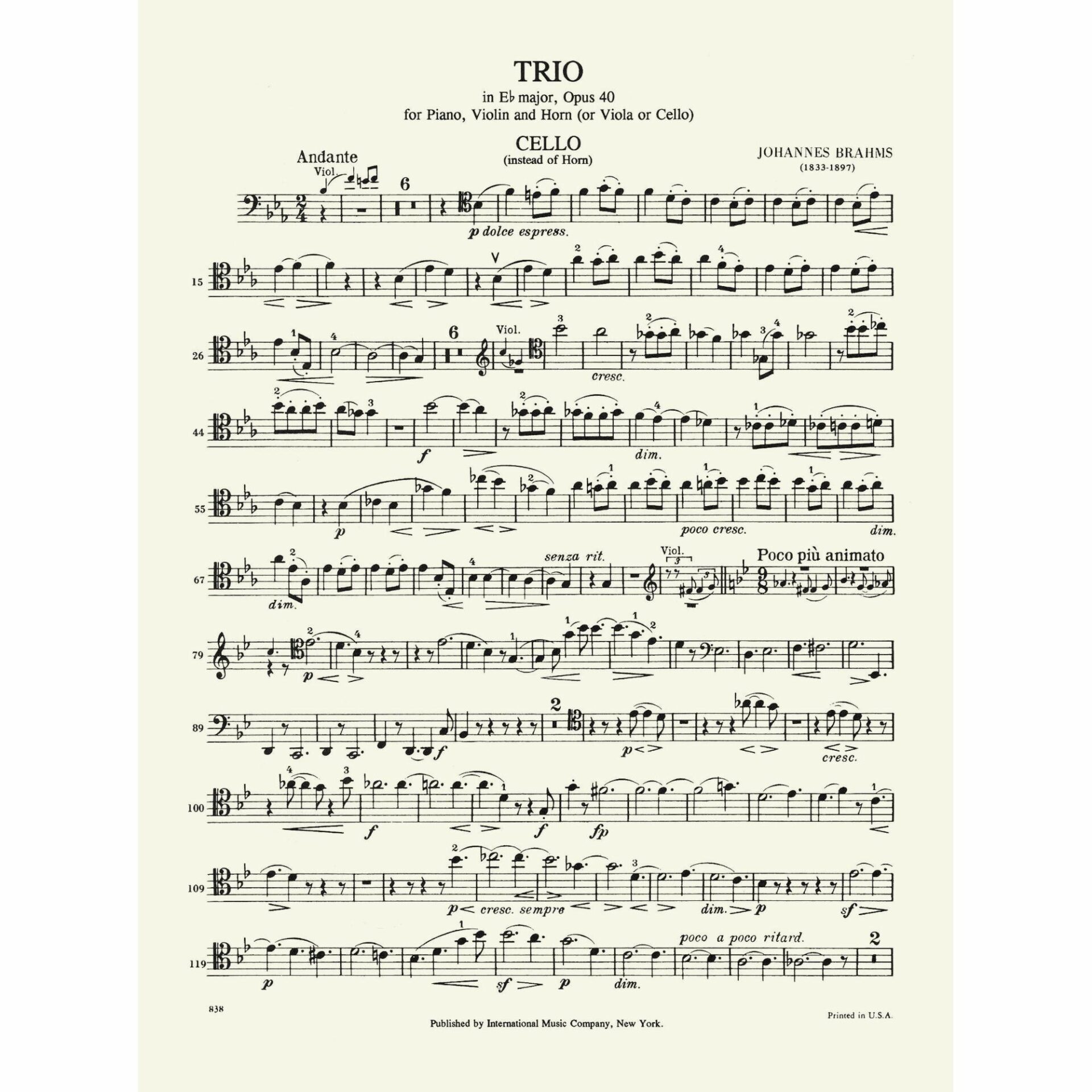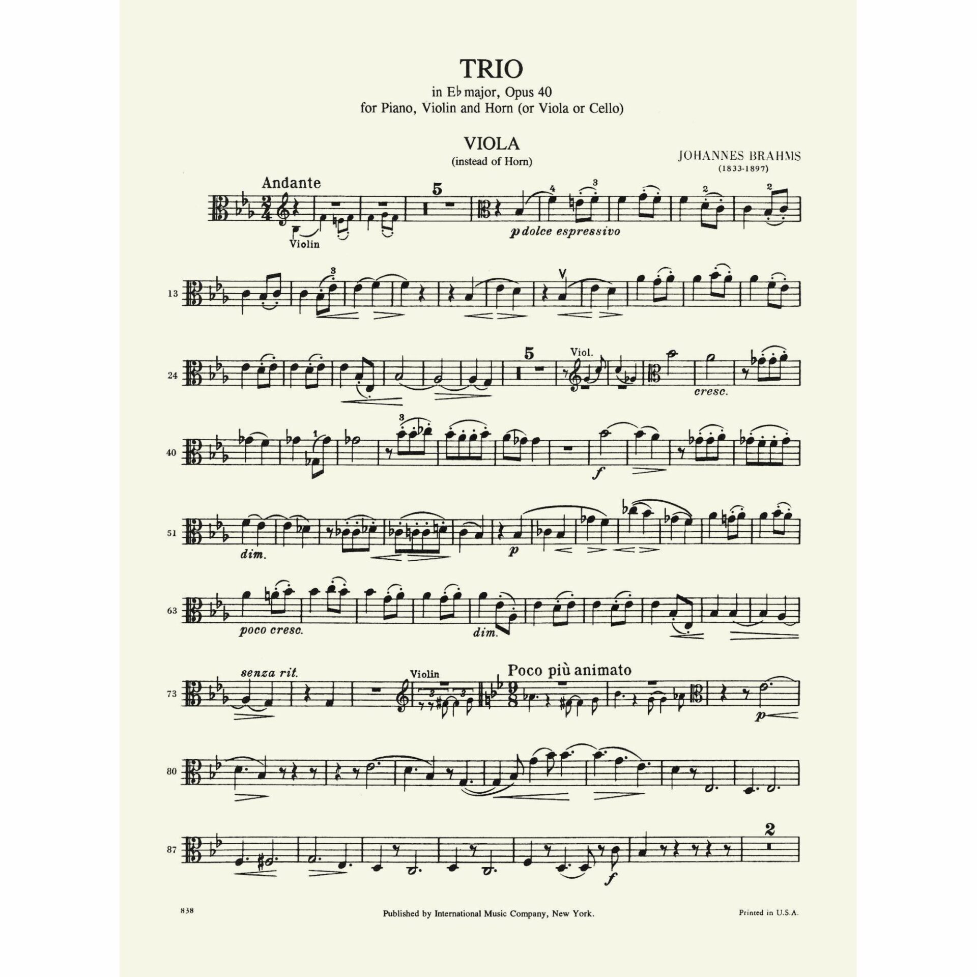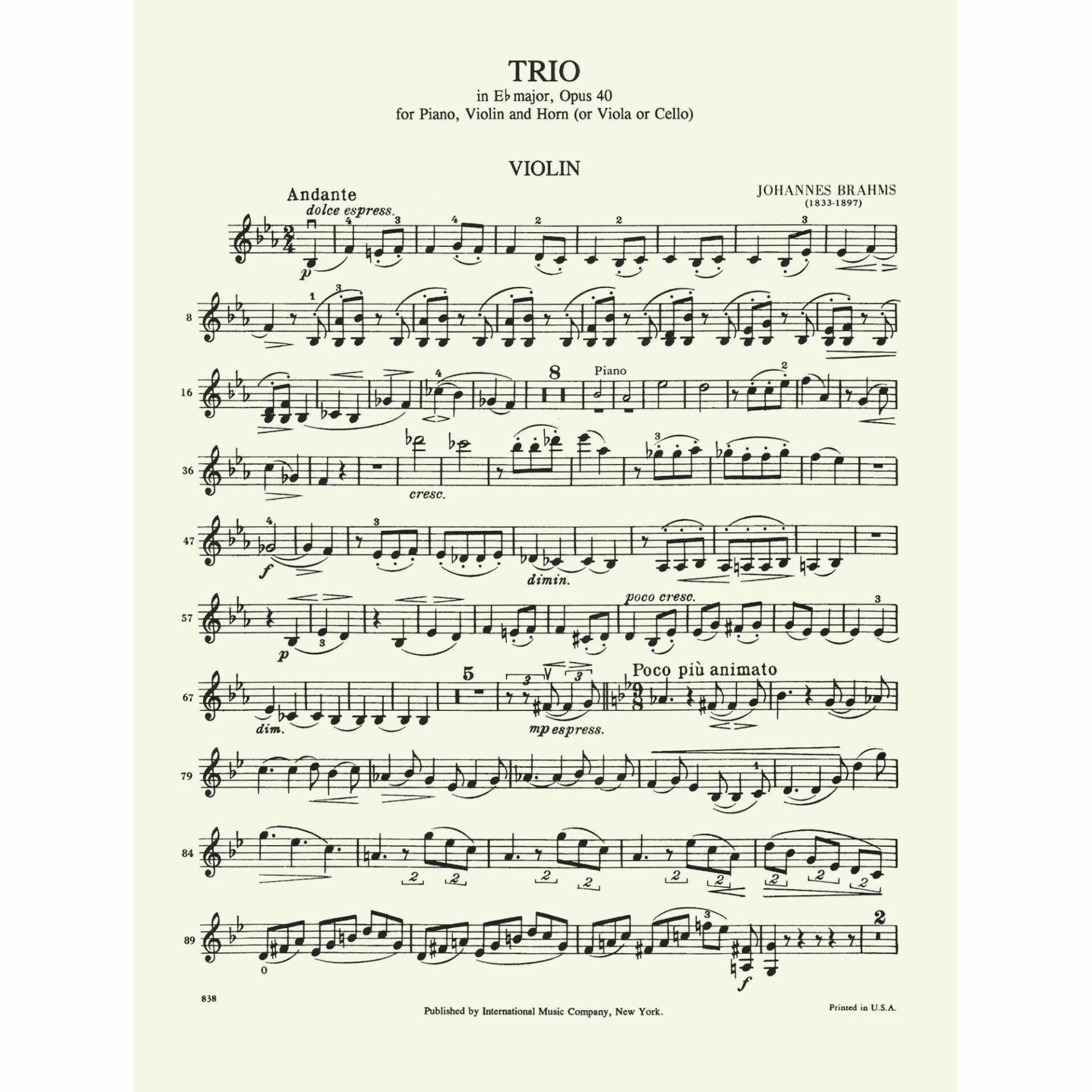Instrumentation: Horn (E-flat), violin, and piano.  Includes the horn part transcribed for cello and viola.