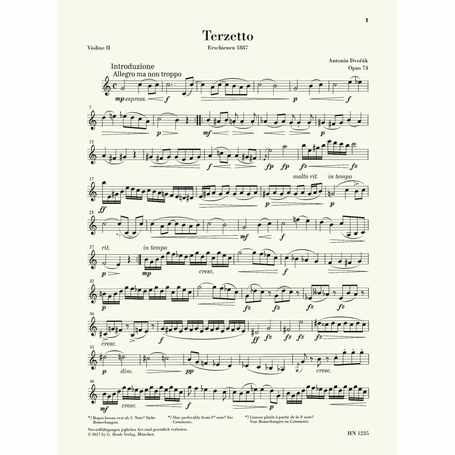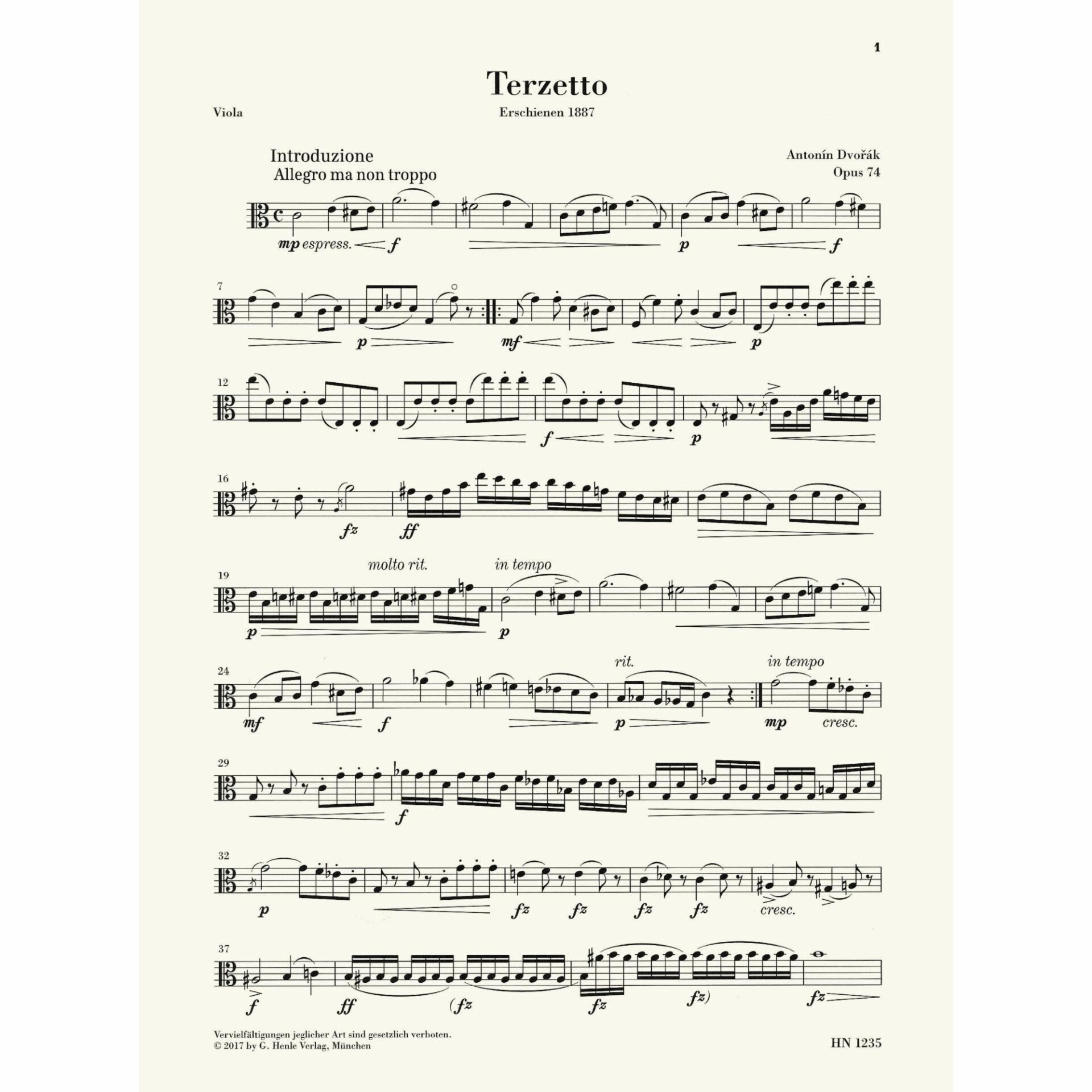 Dvorak — Terzetto in C Major, Op. 74 for Two Violins and Viola