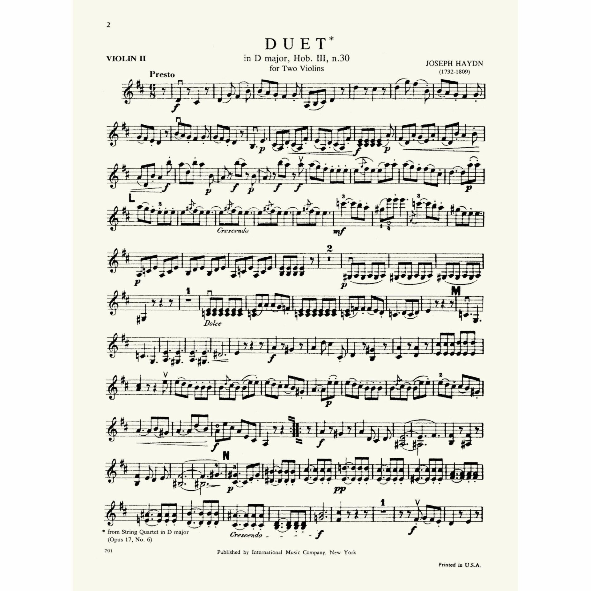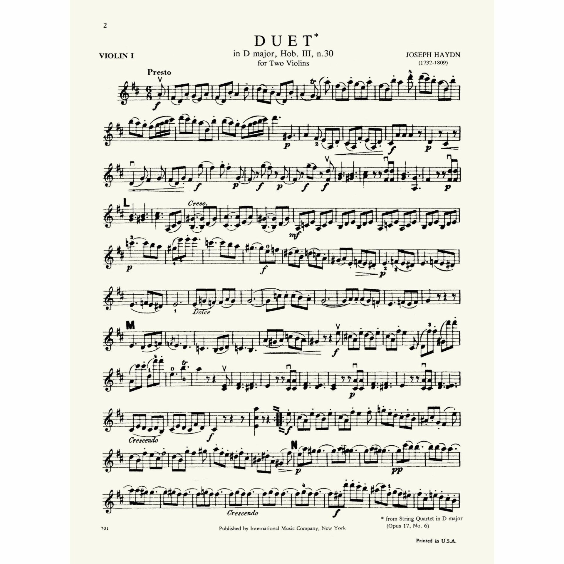 Haydn — Duet in D Major, from String Quartet Op. 17, No. 6, for Two Violins