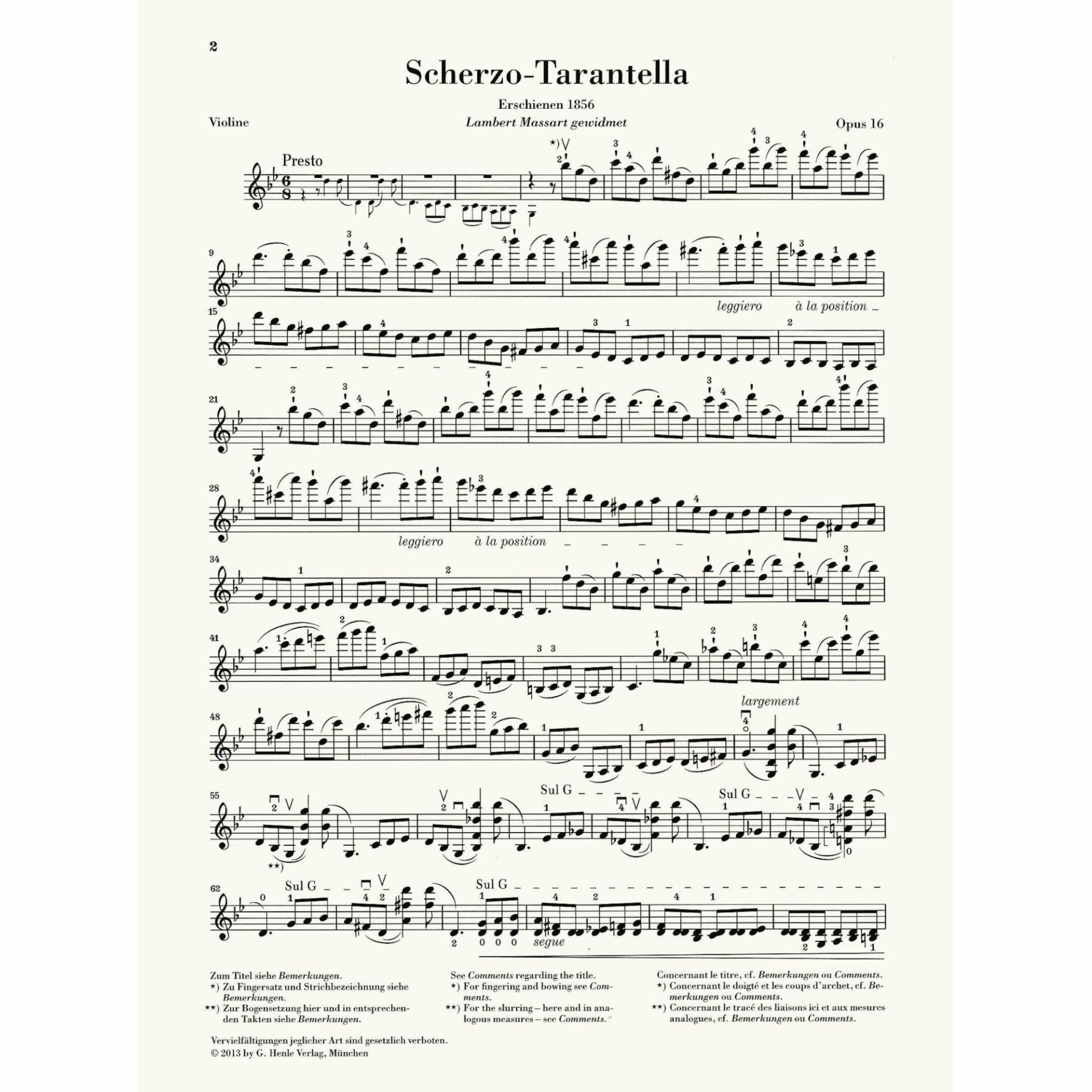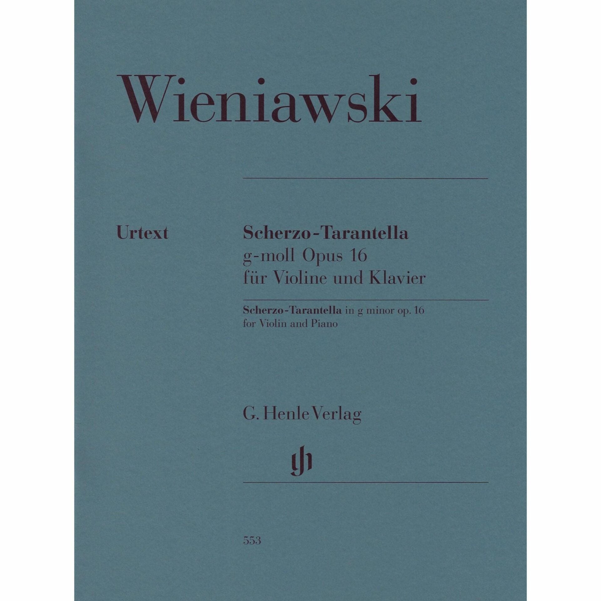 Scherzo-Tarantella in G minor for violin and piano, op. 16. Henryk Wieniawski. Edited by Ray Iwazumi. Includes a supplementary violin part marked by the editor. Published by G. Henle.